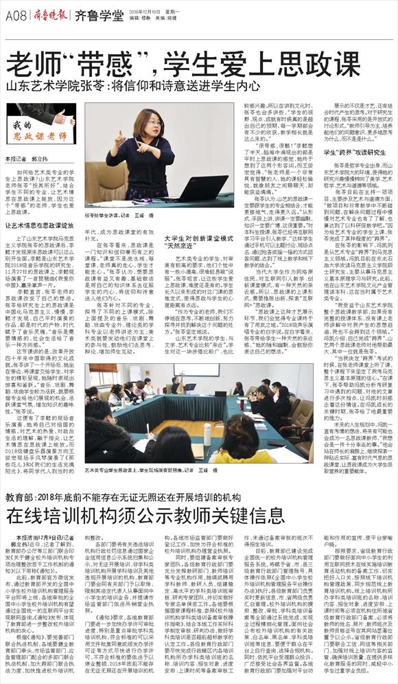 张苓认为,山艺的思政课一定要跟员工的专业相结合,才能更接地气,走得更久远。“从形式、手段上讲,讲课一定要幽默,知识一定要广博,这很重要。”对本科生授课,张苓已经将互联网学习平台引入教学,“这样员工通过手机可以主题讨论、现场点名、通过抢答或摇一摇的方式回答问题,达到了线上教学和线下教学的结合。”