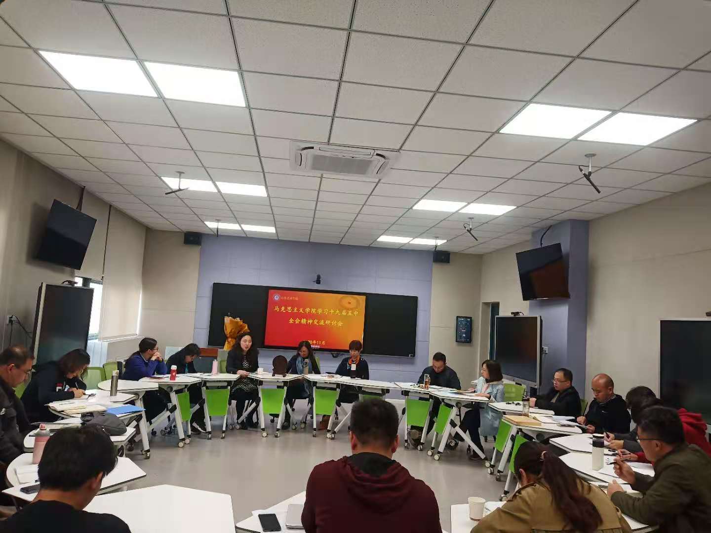 11月11日下午3点,VSport体育组织全体教师在长清校区智慧教室召开了十九届五中全会精神交流研讨会,各教研室教师代表分享了个人学习十九届五中全会公报的心得体会,大家针对“十九届五中全会精神如何进思政课堂”的问题进行了热烈的讨论。