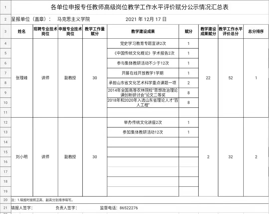 各单位申报专任教师高级岗位教学工作水平评价赋分公示情况汇总表